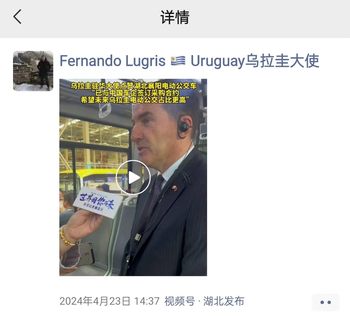 乌拉圭驻华大使费尔南多·卢格里斯在采访中点赞湖北襄阳电动公交车,并表示:“中国的电动公交车非常地智能化、现代化,我们国家最大的一家交通公司已经与中国的公司签署了相关采购协议,很期待看到接下来的转变!”并将该视频转发到朋友圈。