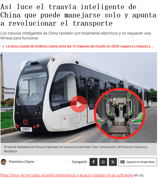 秘鲁记者Francisco Claros在秘鲁主流媒体《共和国报》发表的文章《这是中国的自动驾驶电车,它将彻底改变现有的交通方式》中所说:“ 中国的智能电动公交车不需要铁轨即可运行。这是一种交通方式的大变革,让我看到了未来交通工具的样子。”