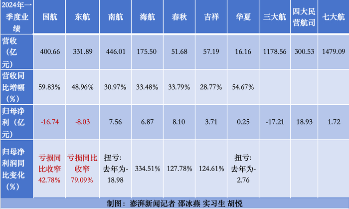 截至4月29日晚间,中国国航(601111.SH)、中国东航(600115.SH)、南方航空(600029.SH)、海航控股(600221.SH)、春秋航空(601021.SH)、吉祥航空(603885.SH)、华夏航空(002928.SZ)七家上市航司陆续披露完2024年一季度业绩公告。