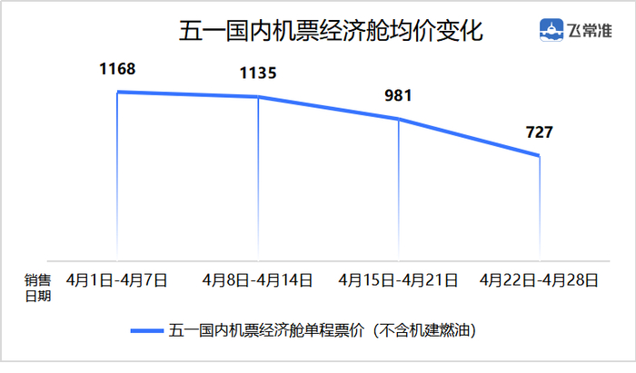 截至4月29日,据第三方出行平台“飞常准”APP 4月机票销售数据统计,五一假期国内经济舱机票均价呈逐步下跌趋势。4月首周购买的五一国内经济舱均价在千元以上(不含税),4月第4周机票均价已降至700元左右。环比4月首周跌幅38%。