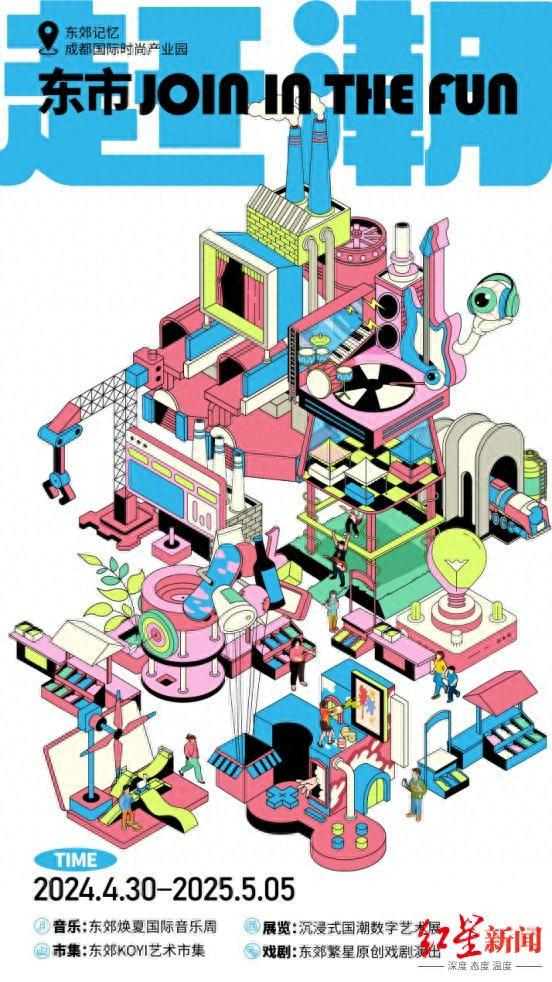 “五一”期间,东郊记忆以“赶潮·东市 Join in the Fun”为主题,将持续举办超过60余场文旅活动,包含赶潮共创艺术展、东郊焕夏国际音乐周、东郊KOYI艺术市集、沉浸式国潮数字艺术展和东郊繁星原创戏剧演出等内容,涵盖音乐戏剧、艺术市集、文博展览、共创艺术展等,一系列活动将给大众游客带来松弛多元的假日生活体验。