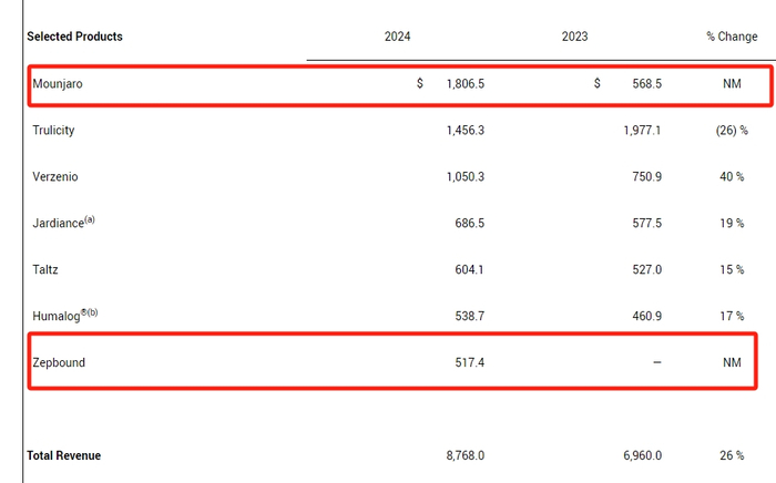 从最新的一季报可以看到,Mounjaro收入18.07亿美元,未达华尔街预期;Zepbound收入5.17亿美元,超过华尔街预期。按此计算,Tirzepatide一个品种在一季度为礼来贡献了23.24亿美元,占总营收的比重约为26%。减重版Zepbound在上市后第一个完整销售年的收入也有望超过10亿美元。