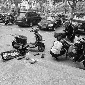 褡裢坡附近一门店人员正在修车,电动车电池仓被打开。