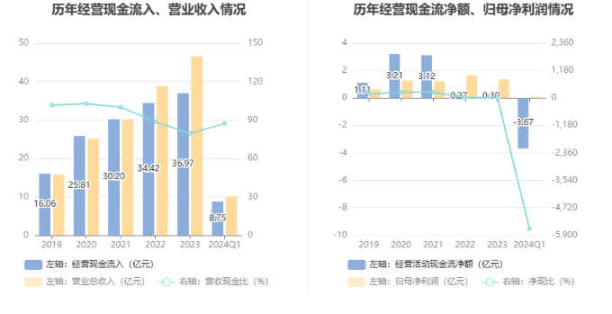 2024年第一季度,公司营业收入现金比为87.24%,净现比为-5621.36%。