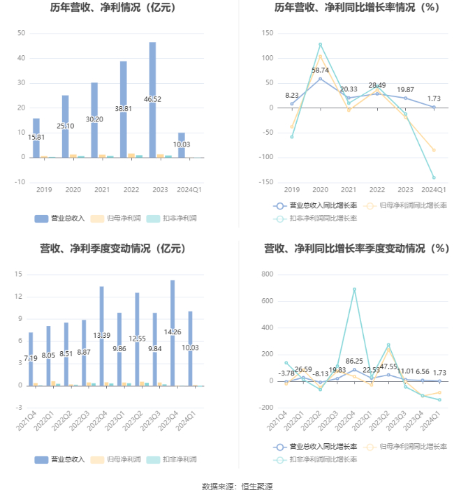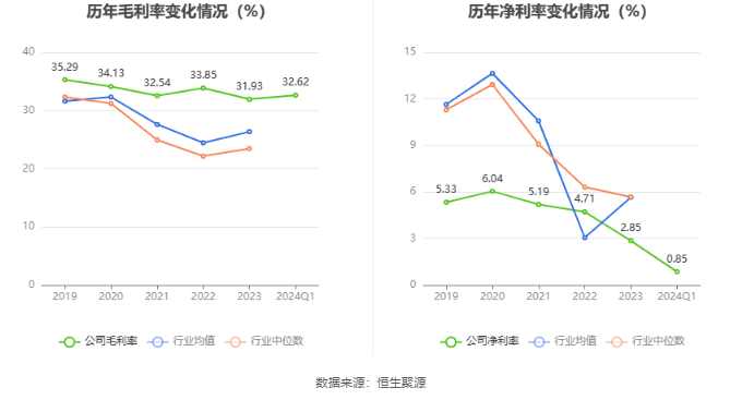 2024年第一季度,公司毛利率为32.62%,同比下降0.95个百分点;净利率为0.85%,较上年同期下降3.62个百分点。