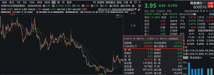 2017年四季度到2023年四季度,民生银行连续六年震荡下跌,区间跌幅超24%,整体持仓收益较差。进入2024年,随着地产风险的释放,和高股息类资产的走强,民生银行等银行股才逐渐走出下跌趋势,迎来一波显著上涨。但提前减仓的投资者则倒在了黎明前。