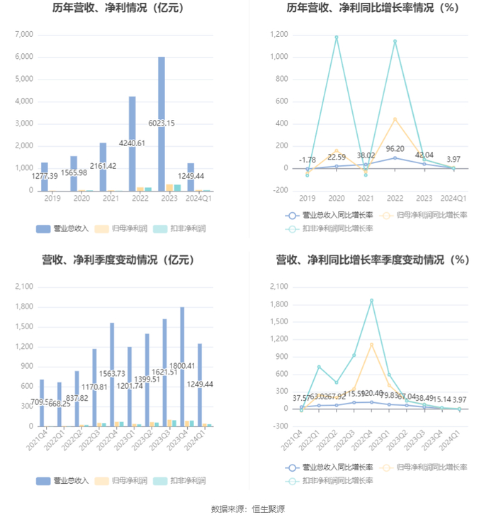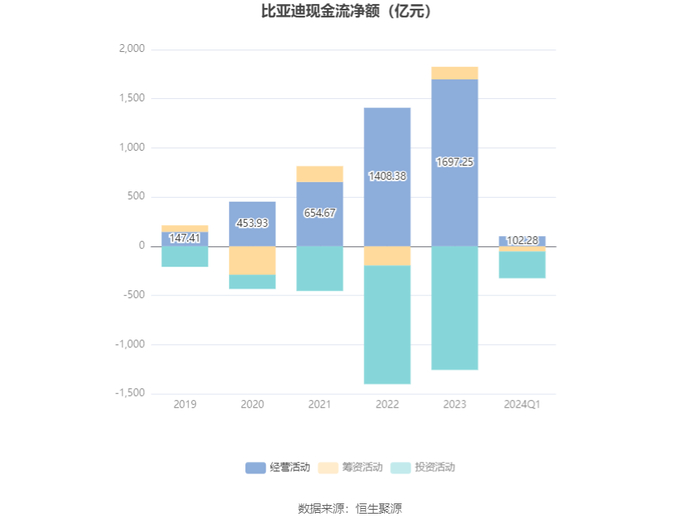 2024年第一季度,公司经营活动现金流净额为102.28亿元,同比下降29.29%;筹资活动现金流净额-51.84亿元,同比减少172.34亿元;投资活动现金流净额-272.70亿元,上年同期为-226.97亿元。