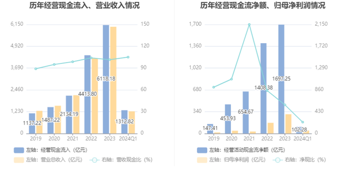 2024年第一季度,公司营业收入现金比为105.07%,净现比为223.87%。