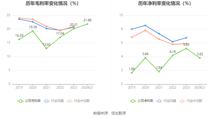 2024年第一季度,公司毛利率为21.88%,同比上升4.02个百分点;净利率为3.82%,较上年同期上升0.18个百分点。