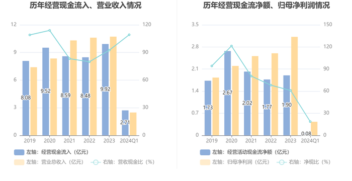 2024年第一季度,公司营业收入现金比为109.27%,净现比为18.64%。