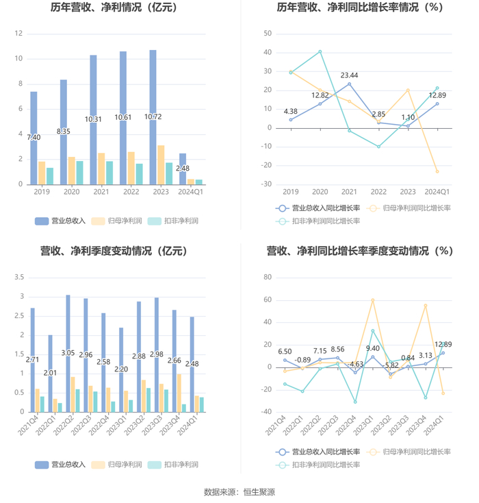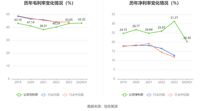 2024年第一季度,公司毛利率为43.35%,同比上升2.57个百分点;净利率为20.30%,较上年同期下降6.21个百分点。