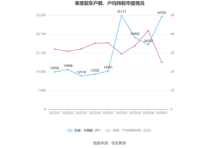 筹码集中度方面,截至2024年一季度末,公司股东总户数为3.48万户,较上年末增长了1.05万户,增幅43.43%;户均持股市值由上年末的41.93万元下降至25.11万元,降幅为40.11%。