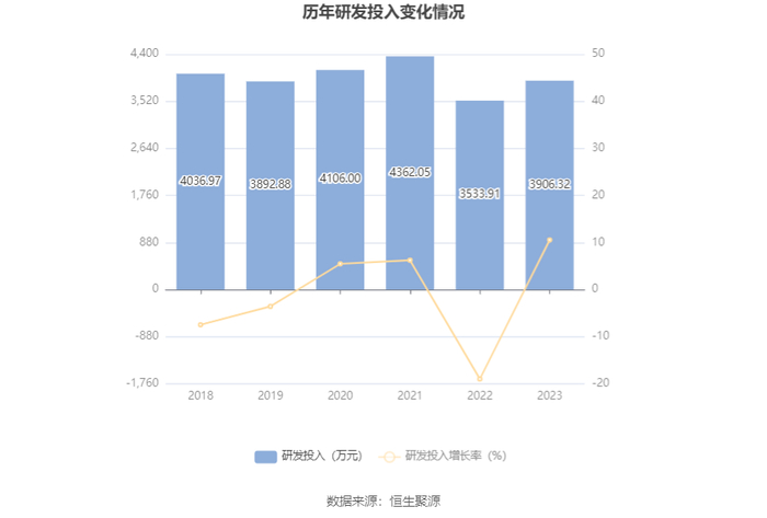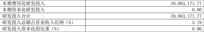 2023年全年,公司研发投入金额为3906.32万元,同比增长10.54%;研发投入占营业收入比例为3.19%,相比上年同期上升0.38个百分点。此外,公司全年研发投入资本化率为0。