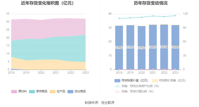 从存货变动来看,截至2023年年末,公司存货账面价值为32.05亿元,占净资产的116.45%,较上年末减少2900.39万元。其中,存货跌价准备为1942.4万元,计提比例为0.6%。