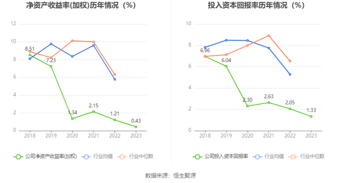 数据显示,2023年公司加权平均净资产收益率为0.43%,较上年同期下降0.78个百分点;公司2023年投入资本回报率为1.33%,较上年同期下降0.72个百分点。