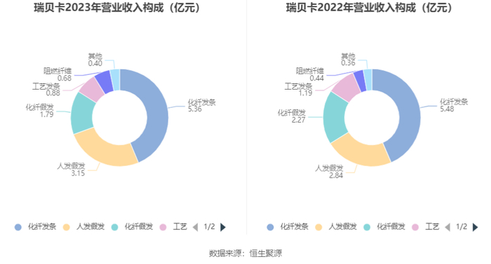 分产品来看,2023年公司主营业务中,化纤发条收入5.36亿元,同比下降2.06%,占营业收入的43.76%;人发假发收入3.15亿元,同比增长10.71%,占营业收入的25.69%;化纤假发收入1.79亿元,同比下降21.17%,占营业收入的14.57%。