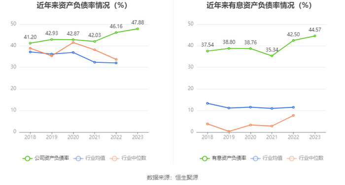 在偿债能力方面,公司2023年年末资产负债率为47.88%,相比上年末上升1.72个百分点;有息资产负债率为44.57%,相比上年末上升2.07个百分点。