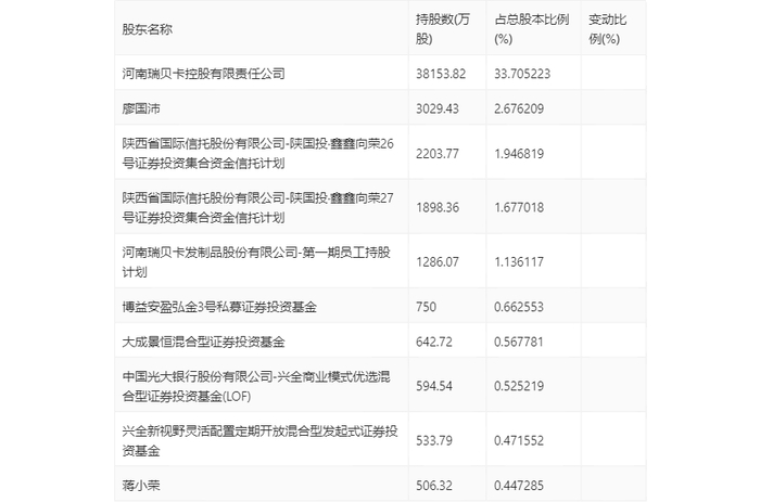 年报显示,2023年年末公司十大流通股东中,新进股东为廖国沛、中国光大银行股份有限公司-兴全商业模式优选混合型证券投资基金(LOF)、兴全新视野灵活配置定期开放混合型发起式证券投资基金,取代了三季度末的国金量化多因子股票型证券投资基金、丑建忠、国金量化精选混合型证券投资基金。在具体持股比例上,河南瑞贝卡发制品股份有限公司-第一期员工持股计划、大成景恒混合型证券投资基金持股有所下降。