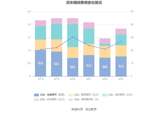 2023年,公司期间费用为3.32亿元,较上年同期增加6685.58万元;期间费用率为27.12%,较上年同期上升6.02个百分点。其中,销售费用同比增长6.76%,管理费用同比下降5.76%,研发费用同比增长10.54%,财务费用同比增长328.55%。