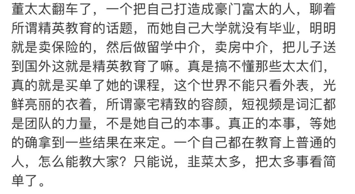 单亲妈妈的人设,做微商、带货甚至搞传消都是好赛道,但董太偏偏选了海外留学和精英赛道。