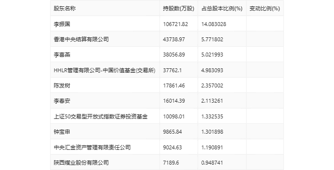 一季报显示,2024年一季度末公司十大流通股东中,持股最多的为李振国,占比14.08%。十大流通股东名单相比2023年年报维持不变。在具体持股比例上,陈发树、上证50交易型开放式指数证券投资基金、钟宝申持股有所上升,李振国、香港中央结算有限公司、李喜燕、中央汇金资产管理有限责任公司持股有所下降。