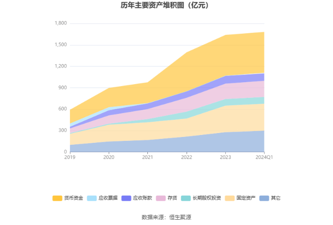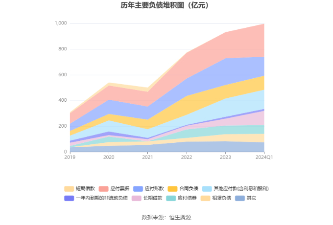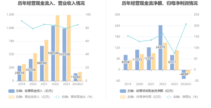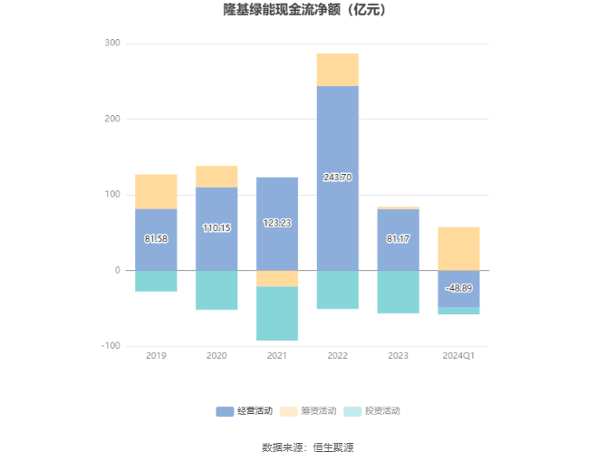 2024年第一季度,公司经营活动现金流净额为-48.89亿元,同比减少15.64亿元,主要系应收款项回款下降所致;筹资活动现金流净额57.46亿元,同比增加60.61亿元;投资活动现金流净额-8.99亿元,上年同期为-20.02亿元。