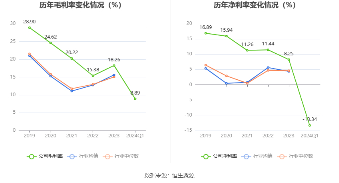 2024年第一季度,公司毛利率为8.89%,同比下降9.02个百分点;净利率为-13.34%,较上年同期下降26.15个百分点。