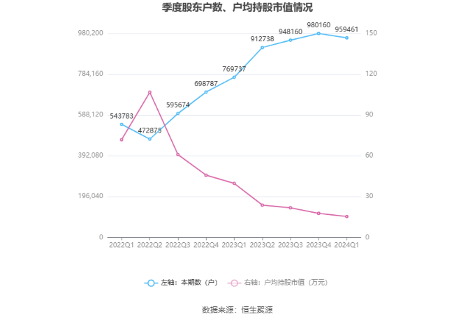 筹码集中度方面,截至2024年一季度末,公司股东总户数为95.95万户,较上年末下降了2.07万户,降幅2.11%;户均持股市值由上年末的17.70万元下降至15.41万元,降幅为12.94%。