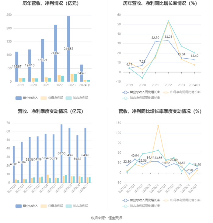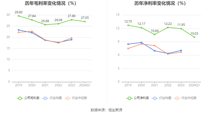 2024年第一季度,公司毛利率为27.05%,同比上升1.48个百分点;净利率为10.03%,较上年同期下降0.69个百分点。