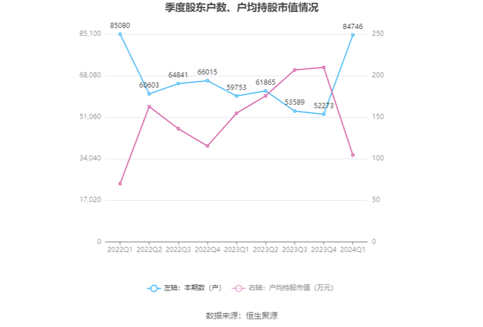 筹码集中度方面,截至2024年一季度末,公司股东总户数为8.47万户,较上年末增长了3.25万户,增幅62.12%;户均持股市值由上年末的209.93万元下降至104.52万元,降幅为50.21%。