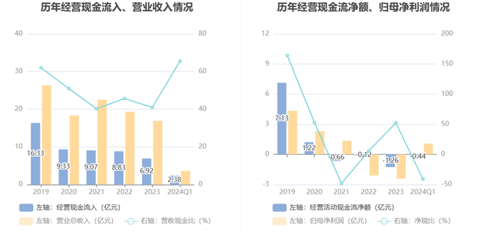 2024年第一季度,公司营业收入现金比为65.59%,净现比为-41.00%。