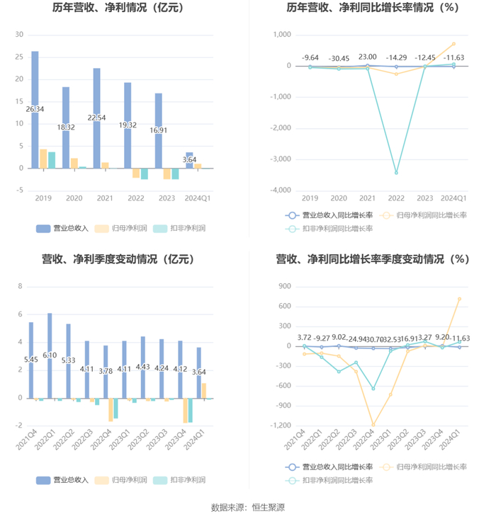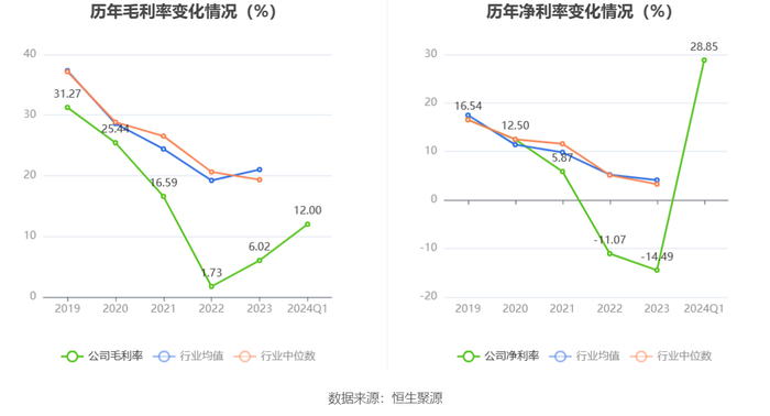 2024年第一季度,公司毛利率为12.00%,同比上升4.84个百分点;净利率为28.85%,较上年同期上升33.33个百分点。