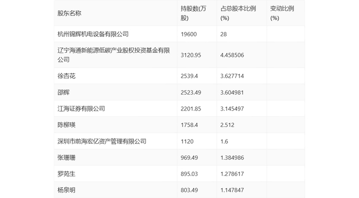 一季报显示,2024年一季度末公司十大流通股东中,持股最多的为杭州锦辉机电设备有限公司,占比28.00%。十大流通股东名单相比2023年年报维持不变。在具体持股比例上,罗苑生持股有所上升,江海证券有限公司持股有所下降。