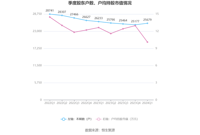筹码集中度方面,截至2024年一季度末,公司股东总户数为2.57万户,较上年末增长了502户,增幅1.99%;户均持股市值由上年末的12.98万元下降至10.11万元,降幅为22.11%。