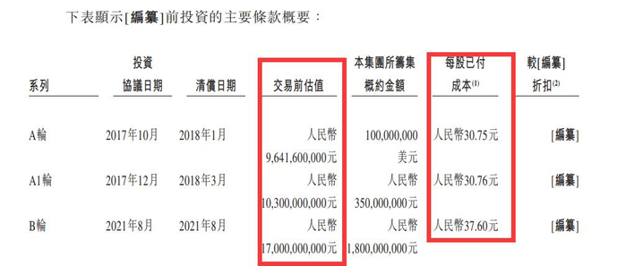 估值上,曹操出行第一轮投前估值达到独角兽级别。2017年A轮融资时,曹操出行估值为96亿元,每股成本为30.75元;2017月12月,A1轮融资时,投前估值攀升至103亿元,每股成本为30.76元;2021年8月,B轮融资时投前估值为170亿元,每股成本为37.60元。