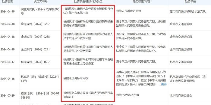 作为曹操出行主体公司,杭州优行科技共计遭遇行政处罚共计175笔,今年为47笔。其中,4月的行政处罚,主要包括杭州优行提供服务的车辆未取得车辆营运证案、提供服务的驾驶人员未取得从业资格证案、网约出租车平台经营者未按规定上传信息案等问题。