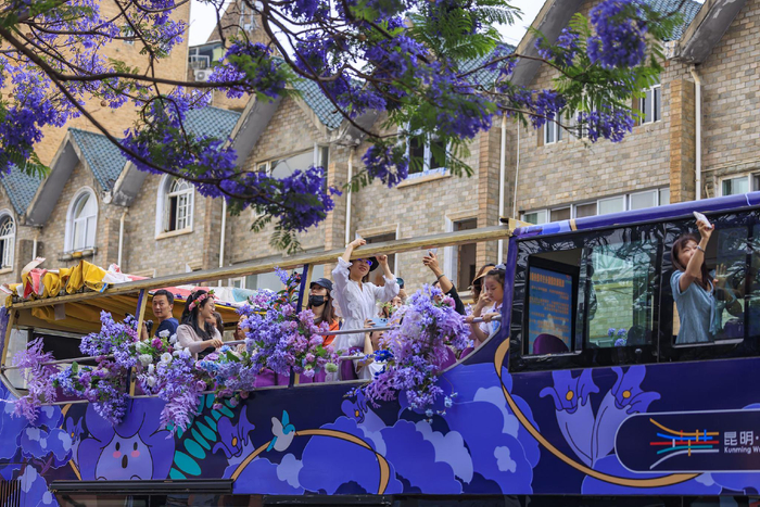 2024年5月1日,昆明,教场中路蓝花楹绽放。据中央气象台消息,5月1日、2日两天南方强降雨和强对流天气有所减弱,全国大部适宜出行。 视觉中国 图
