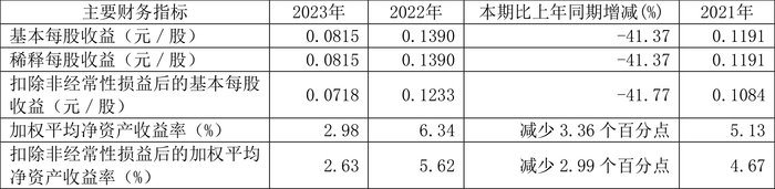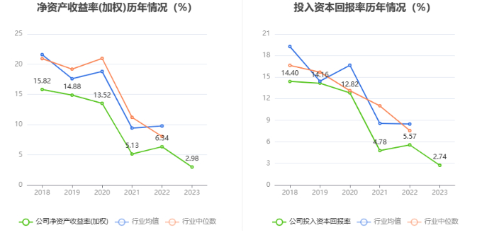 数据显示,2023年公司加权平均净资产收益率为2.98%,较上年同期下降3.36个百分点;公司2023年投入资本回报率为2.74%,较上年同期下降2.83个百分点。