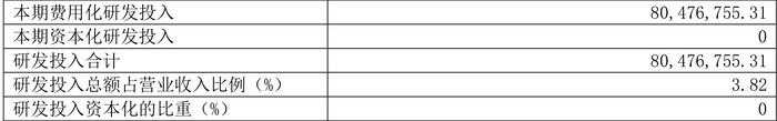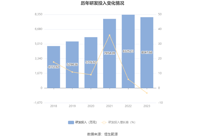 2023年全年,公司研发投入金额为8047.68万元,同比下降3.33%;研发投入占营业收入比例为3.82%,相比上年同期下降0.07个百分点。此外,公司全年研发投入资本化率为0。