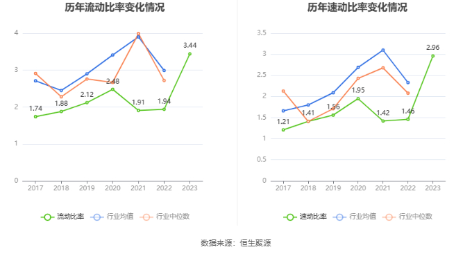 2023年,公司流动比率为3.44,速动比率为2.96。