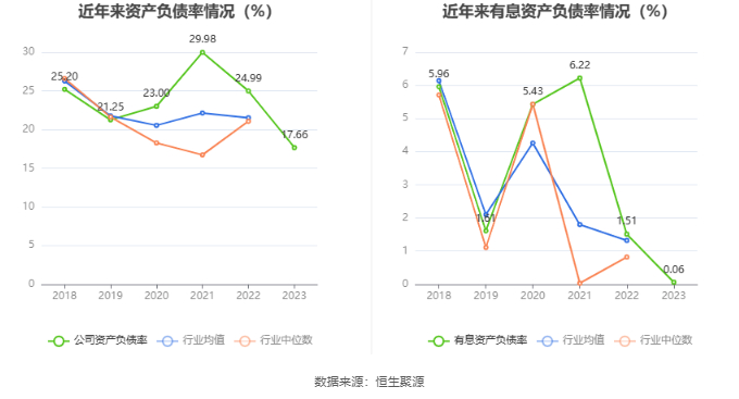 在偿债能力方面,公司2023年年末资产负债率为17.66%,相比上年末下降7.33个百分点;有息资产负债率为0.06%,相比上年末下降1.45个百分点。