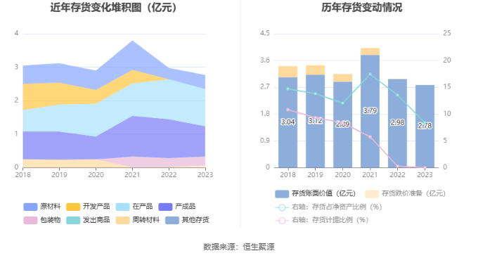 从存货变动来看,截至2023年年末,公司存货账面价值为2.78亿元,占净资产的8.43%,较上年末减少1914.96万元。其中,存货跌价准备为4.74万元,计提比例为0.02%。