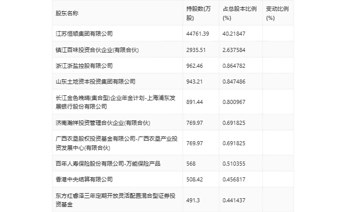 年报显示,2023年年末公司十大流通股东中,新进股东为镇江百味投资合伙企业(有限合伙)、浙江浙盐控股有限公司、山东土地资本投资集团有限公司、济南瀚祥投资管理合伙企业(有限合伙)、广西农垦股权投资基金有限公司-广西农垦产业投资发展中心(有限合伙),取代了三季度末的上海高毅资产管理合伙企业(有限合伙)-高毅邻山1号远望基金、上证综指交易型开放式指数证券投资基金、张藤、百年人寿保险股份有限公司-百年传统、刘彬。在具体持股比例上,长江金色晚晴(集合型)企业年金计划-上海浦东发展银行股份有限公司、东方红睿泽三年定期开放灵活配置混合型证券投资基金持股有所上升,香港中央结算有限公司持股有所下降。