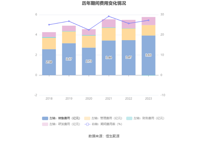 2023年,公司期间费用为5.74亿元,同比增长2453.01万元;期间费用率为27.24%,同比增长1.56个百分点。其中,销售费用同比增长13.22%,管理费用同比下降10.06%,研发费用同比下降3.33%,财务费用-358.25万元,去年同期334.67万元。