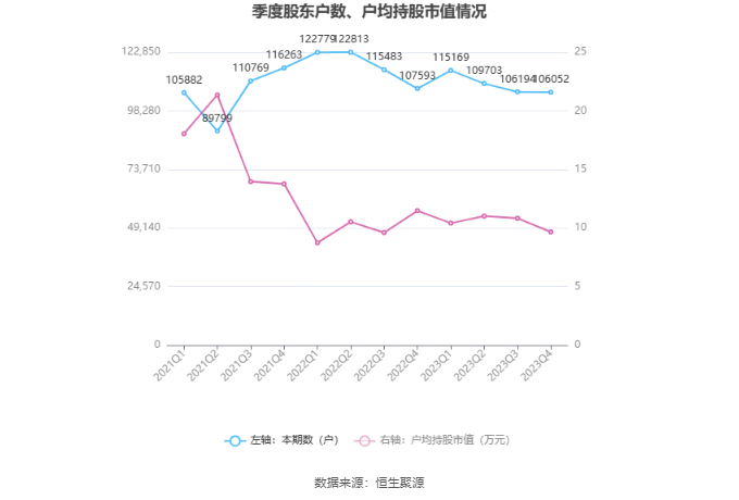 筹码集中度方面,截至2023年年末,公司股东总户数为10.61万户,较三季度末下降了142户,降幅0.13%;户均持股市值由三季度末的10.83万元下降至9.67万元,降幅为10.71%。