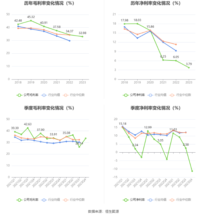 2023年,公司毛利率为32.98%,同比下降1.39个百分点;净利率为3.79%,较上年同期下降2.26个百分点。从单季度指标来看,2023年第四季度公司毛利率为33.63%,同比上升1.63个百分点,环比上升7.49个百分点;净利率为-11.31%,较上年同期下降7.16个百分点,较上一季度下降13.89个百分点。