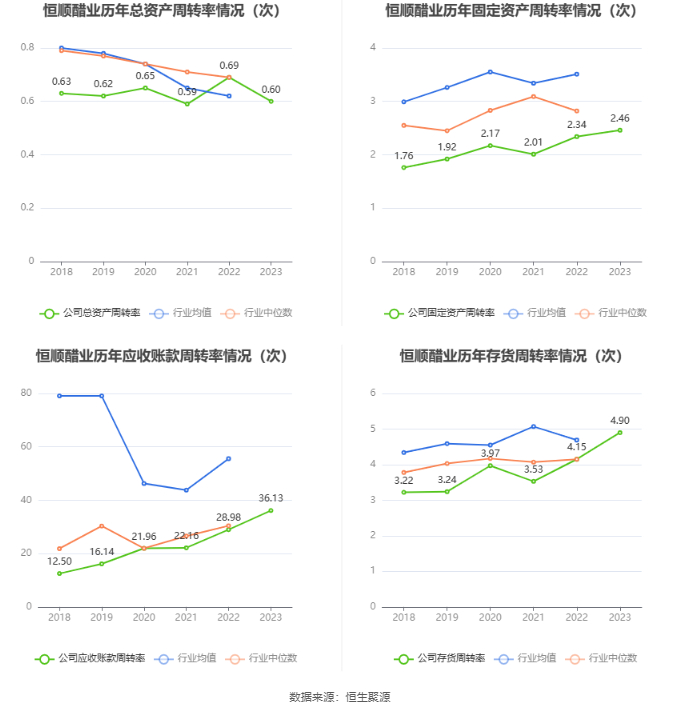 营运能力方面,2023年,公司公司总资产周转率为0.60次,上年同期为0.69次(2022年行业平均值为0.62次,公司位居同行业8/15);固定资产周转率为2.46次,上年同期为2.34次(2022年行业平均值为3.51次,公司位居同行业11/15);公司应收账款周转率、存货周转率分别为36.13次、4.90次。