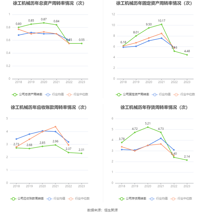 截至2023年末,徐工机械三年营业总收入复合增长率为-2.99%,在工程机械整机行业已披露2023年数据的17家公司中排名第11。三年净利润复合年增长率为5.25%,排名7/17。