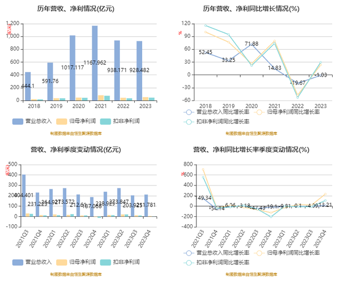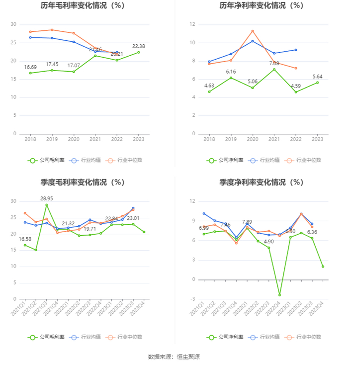 2023年,公司毛利率为22.38%,同比上升2.17个百分点;净利率为5.64%,较上年同期上升1.05个百分点。从单季度指标来看,2023年第四季度公司毛利率为20.64%,同比上升0.44个百分点,环比下降2.37个百分点;净利率为2.01%,较上年同期上升4.38个百分点,较上一季度下降4.35个百分点。