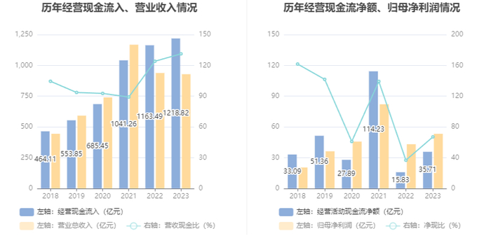 2023年,公司经营活动现金流净额为35.71亿元,同比增长125.59%;筹资活动现金流净额-77.78亿元,同比减少108.67亿元;投资活动现金流净额14.11亿元,上年同期为-56.55亿元。